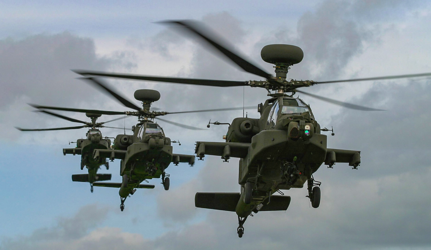 British Army Air Corps WAH-64 Apaches short finals, RAF Shawbury, Shropshire, UK